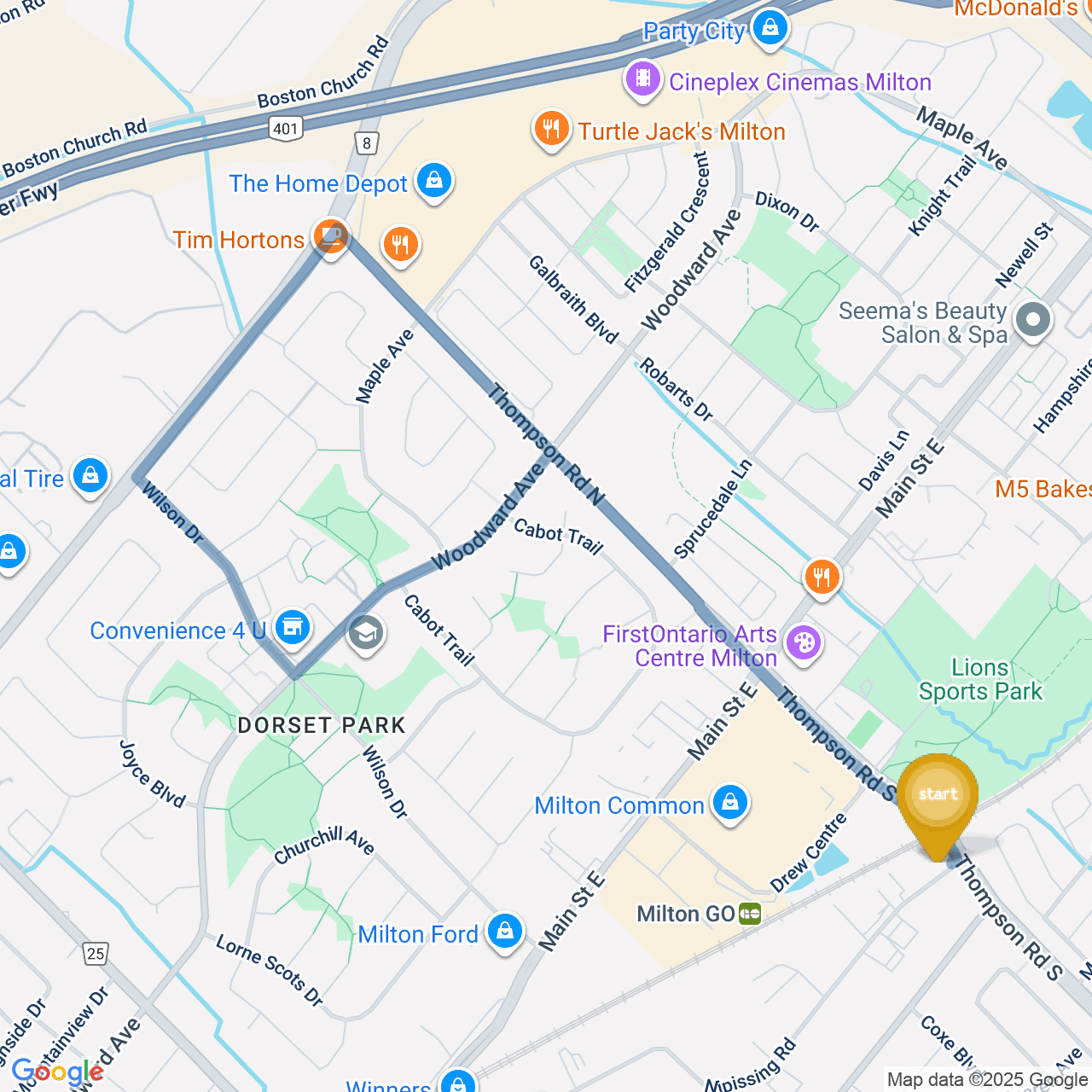 Head southwest on Steeles Ave E/Halton Regional Rd 8