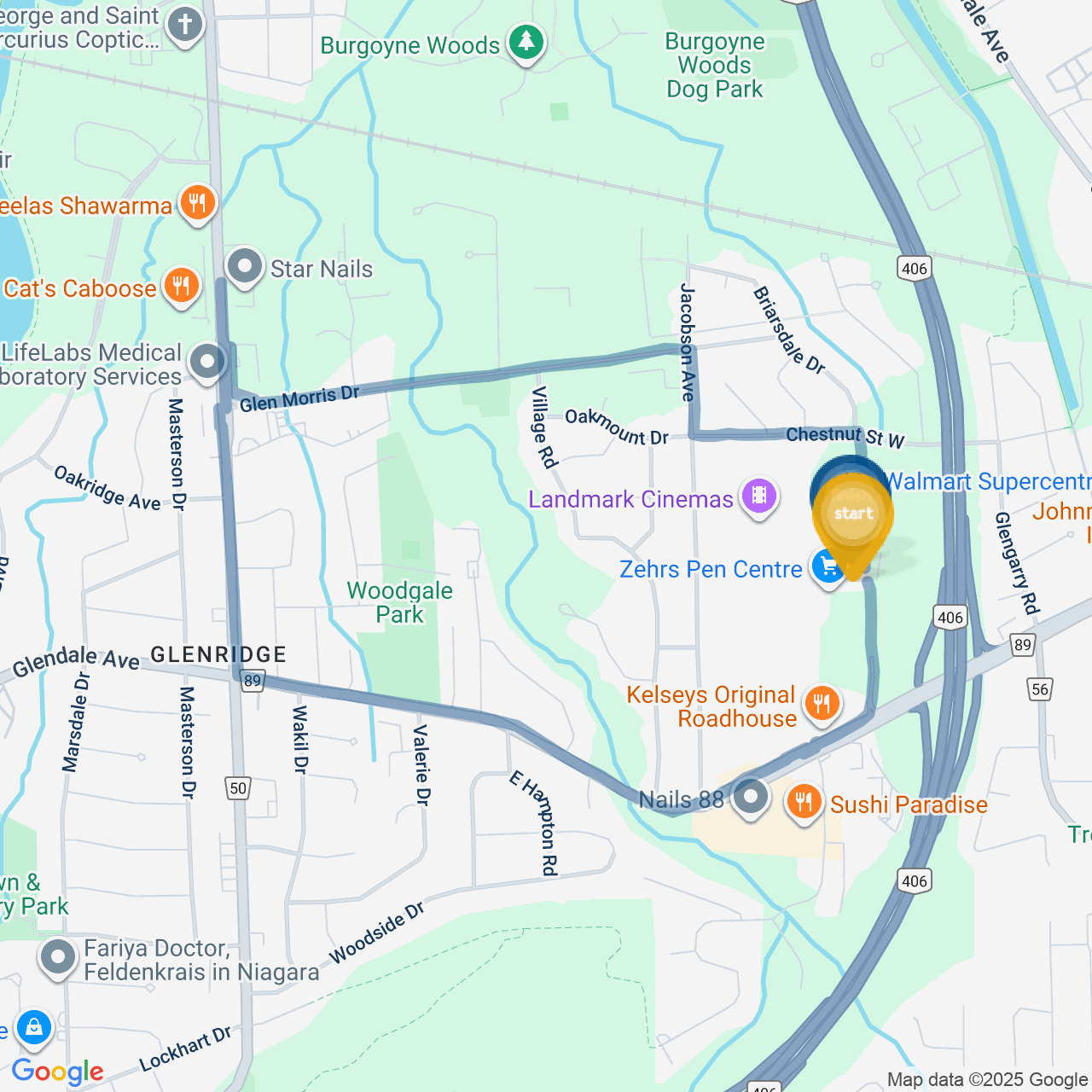 ![]() | Head southwest on Glendale Ave/Regional Rd 89 | 1.4 km16 minutes |