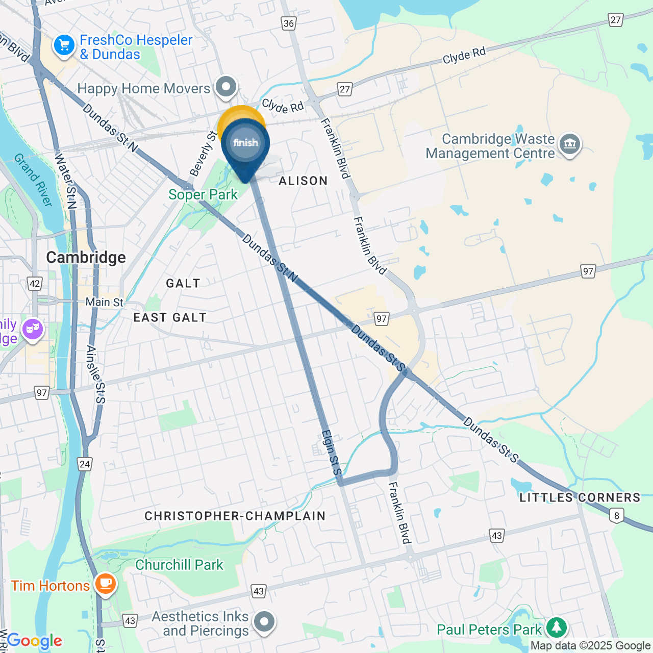 ![]() | Head southwest on Franklin Blvd/Waterloo Regional Rd 36 | 0.6 km7 minutes |