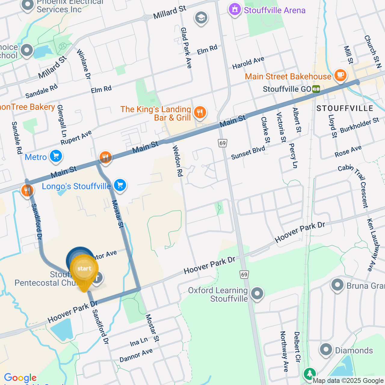 Go south on Sandiford at the lights until you reach back at Stouffville Pentecostal Church.