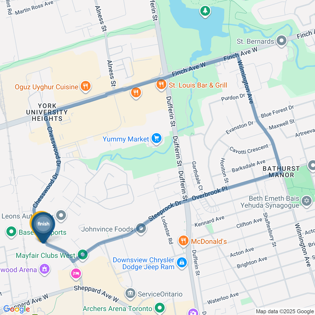 ![]() | Head east on Finch Ave W | 0.1 km1 minute |