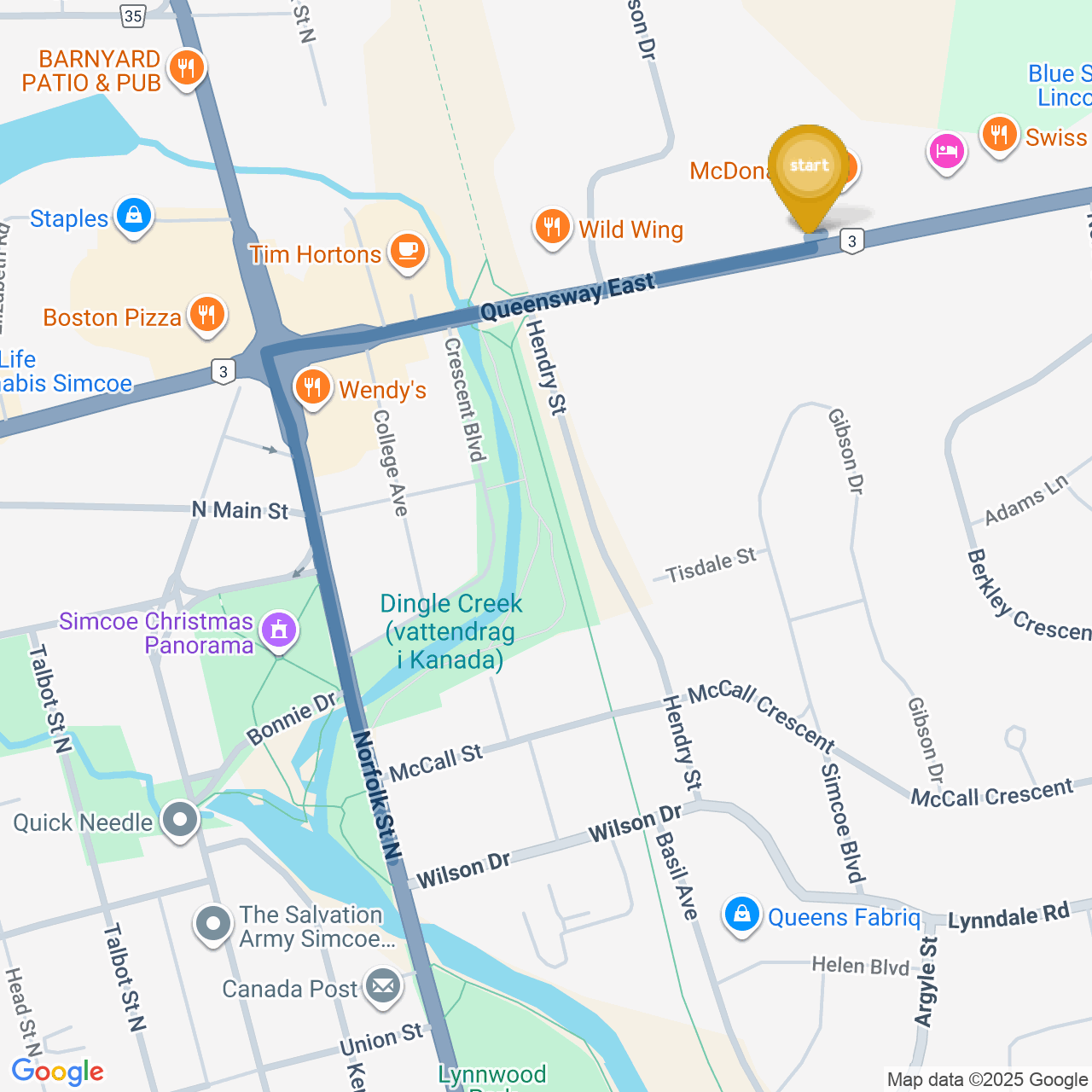 ![]() | Sharp right onto Norfolk St N/Norfolk County Hwy 24 | 50 m< 1 minute |
