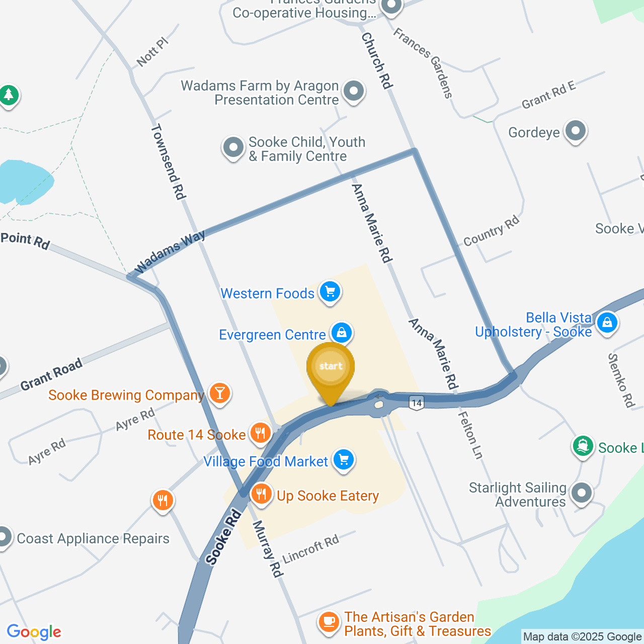 ![]() | Head west on Juan De Fuca Hwy/Sooke Rd/BC-14 W | 0.1 km1 minute |