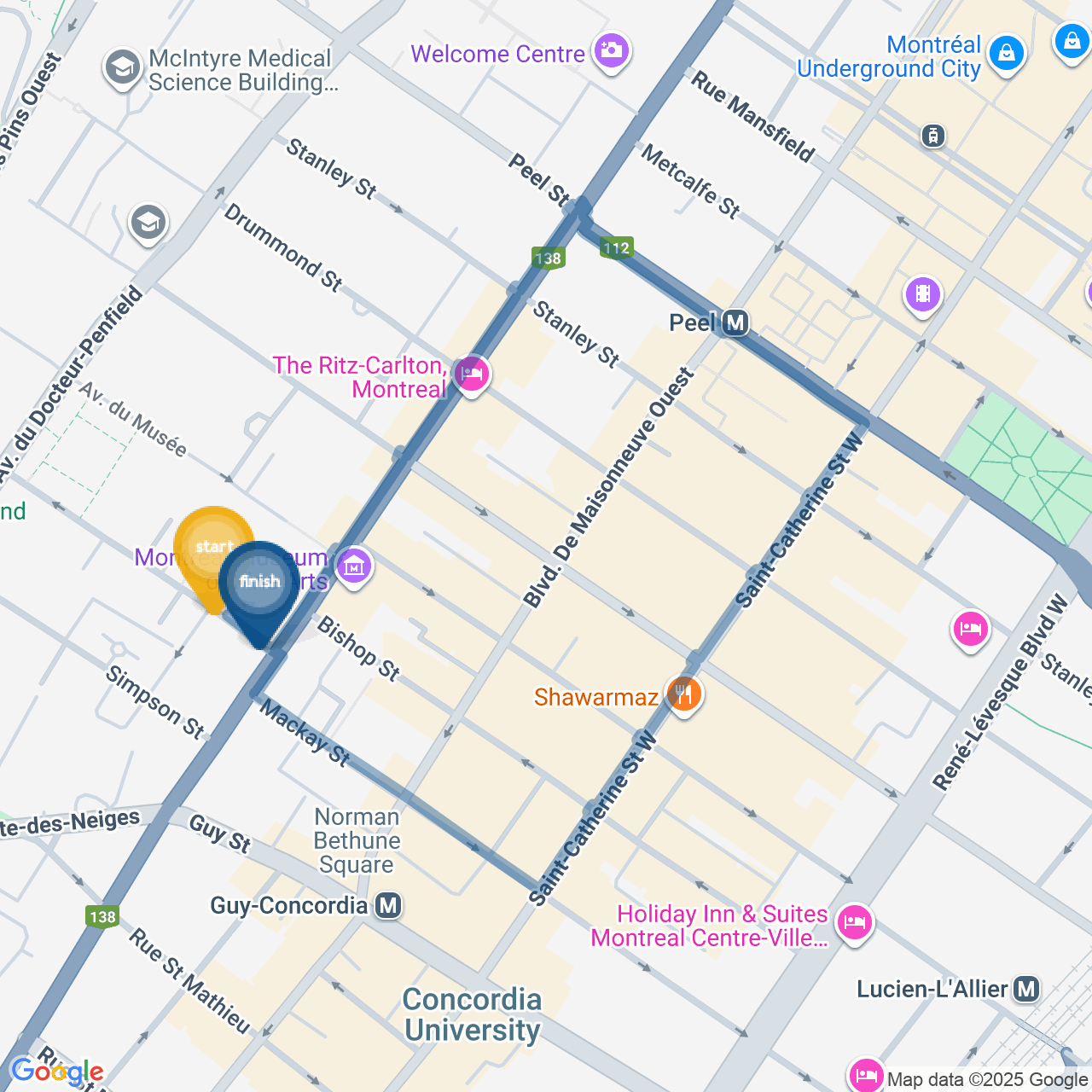 ![]() | Head southeast on Rue Redpath | 0.1 km1 minute |