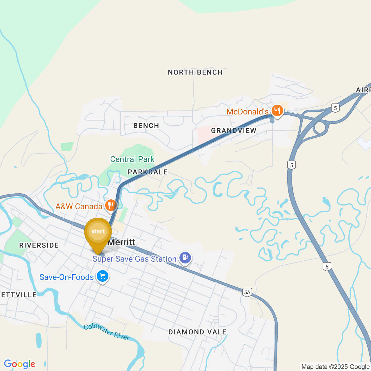 ![]() | Head northeast on Princeton-Kamloops Hwy/Voght St/BC-5A | 0.2 km2 minutes |