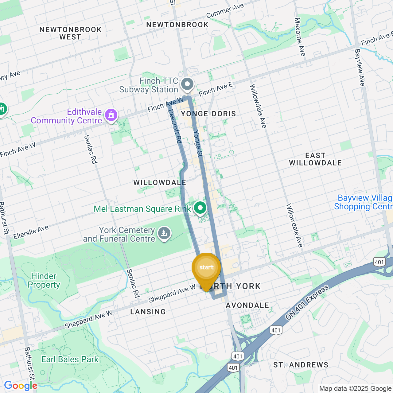 ![]() | Head east on Finch Ave W | 40 m< 1 minute |