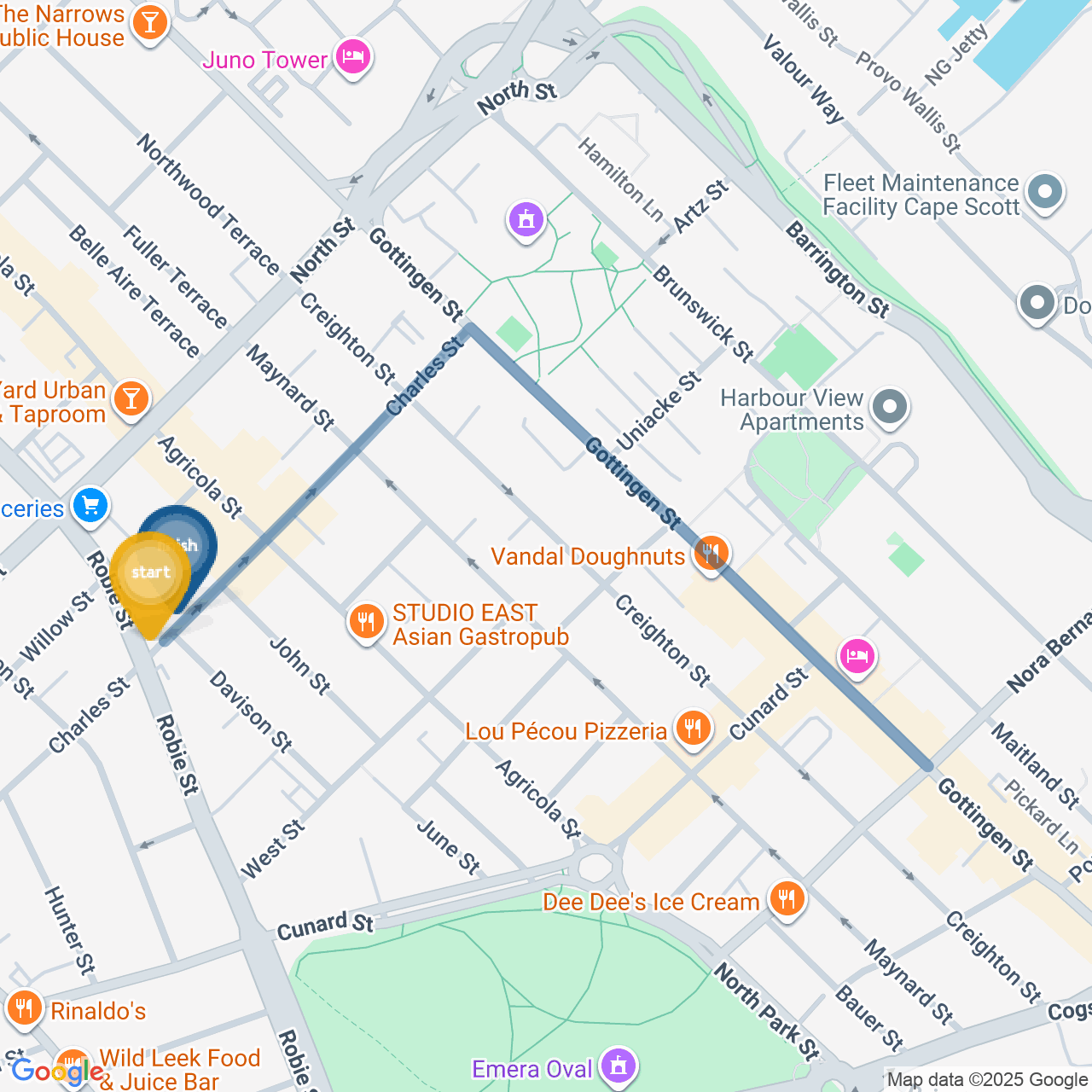![]() | Head southeast on Gottingen St | 0.1 km1 minute |