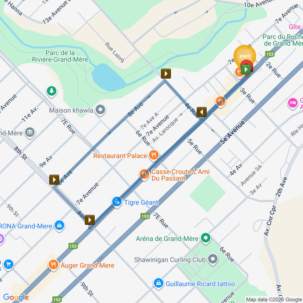 ![]() | Head southwest on Av. de Grand-Mère/QC-153 S | 0.5 km5 minutes |