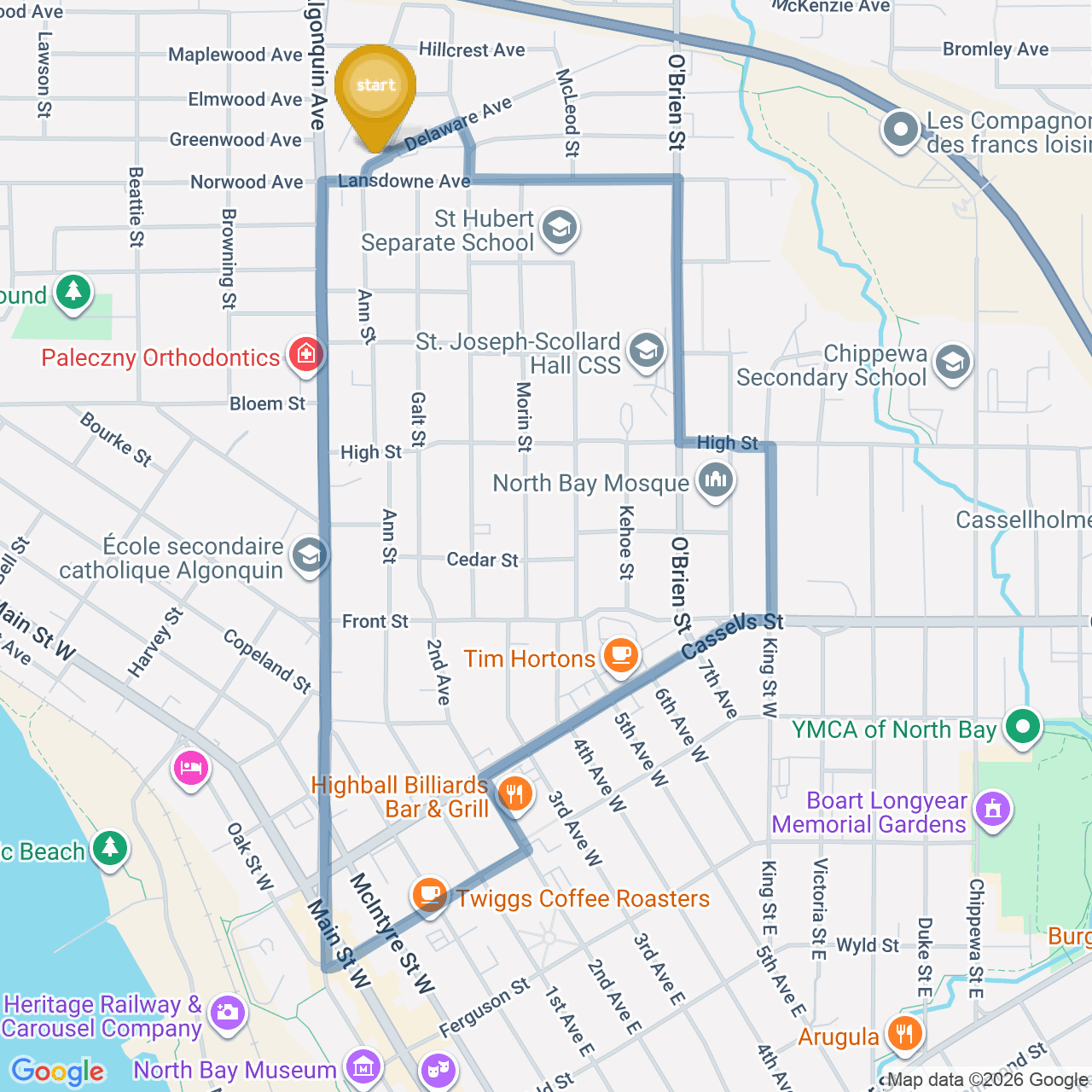 ![]() | Head south on Algonquin Ave | 0.2 km2 minutes |
